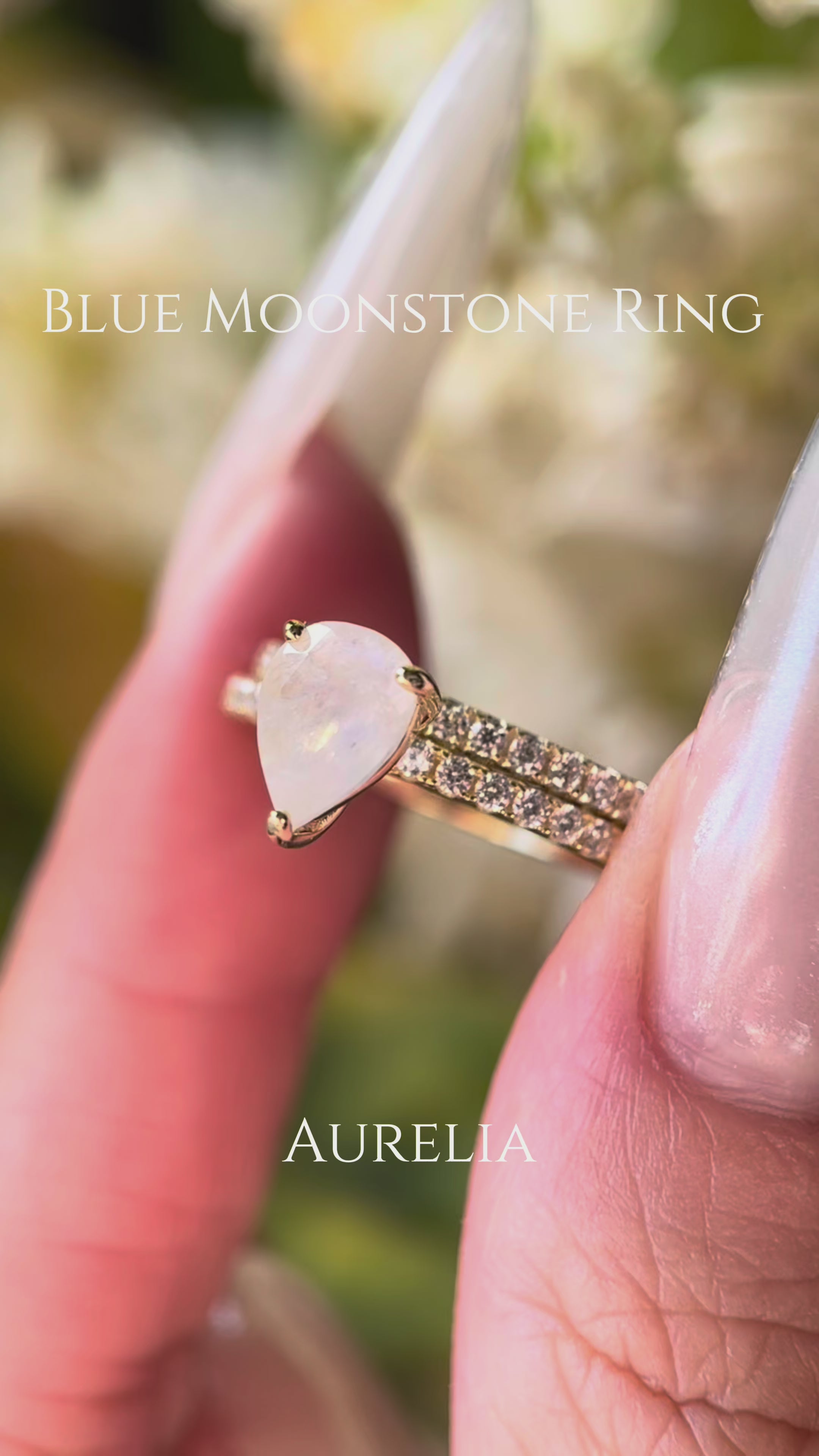 【Ensemble Aurelia】Ensemble unique de bagues de fiançailles artisanales en pierre de lune bleue naturelle de 0,8 ct, forme poire, composé de 2 bagues.