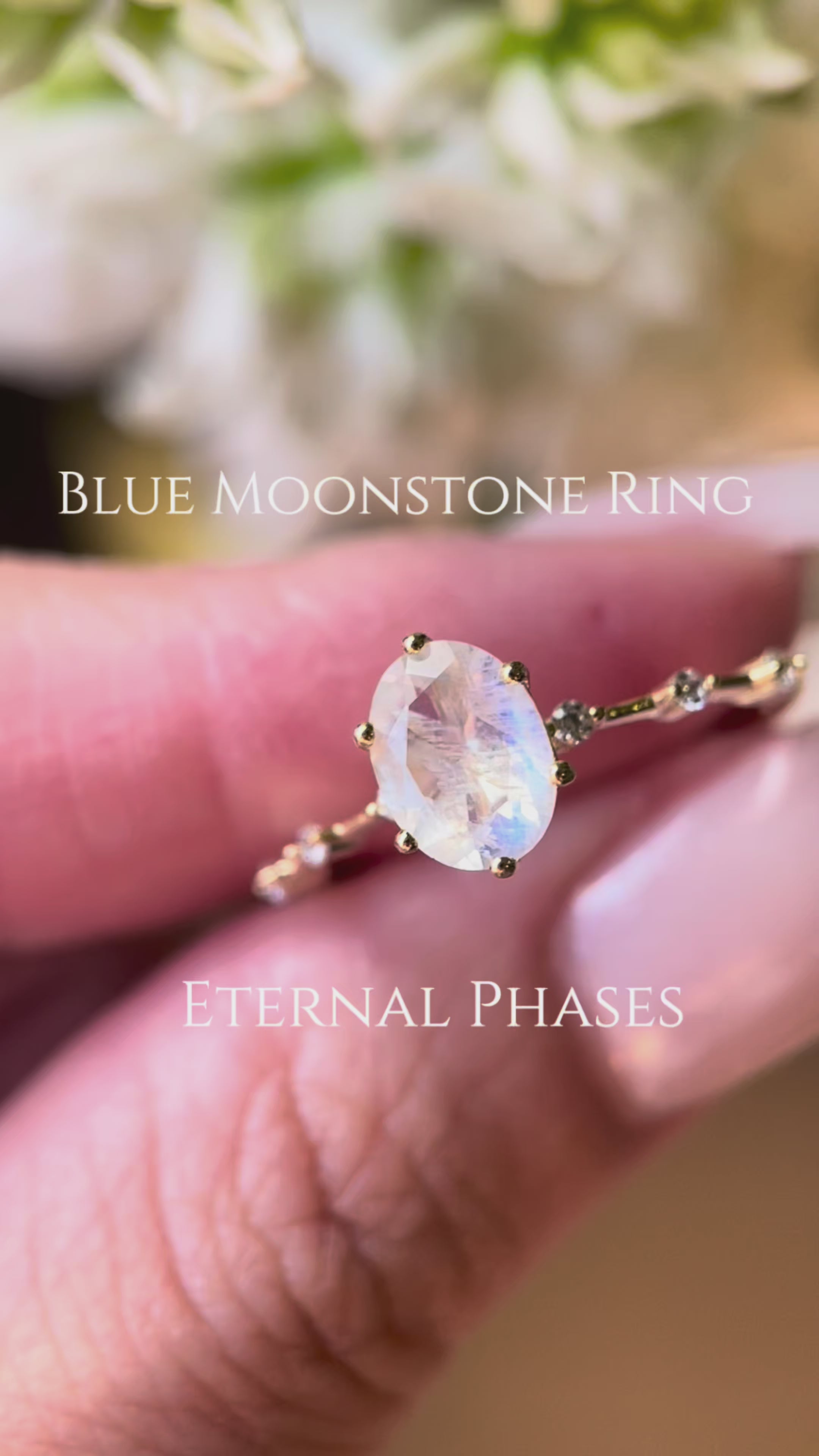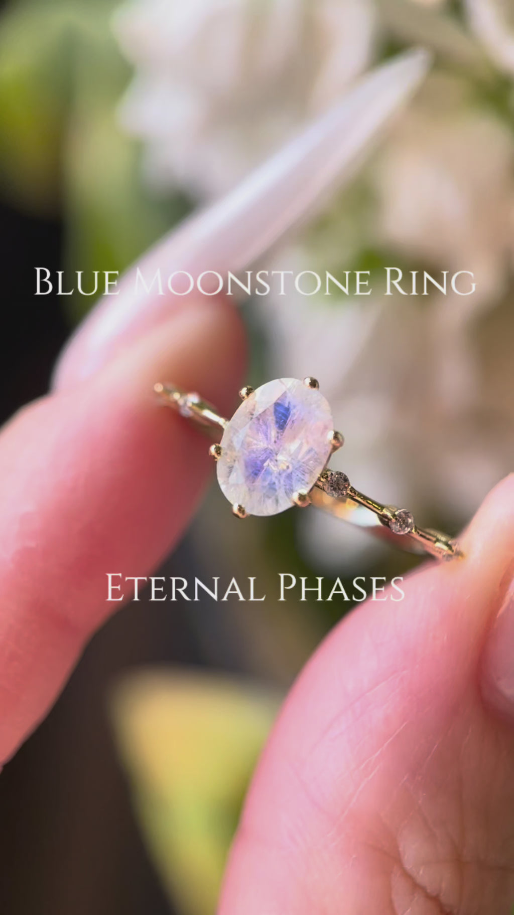 【Phases Éternelles】Bague de fiançailles unique, faite main, en pierre de lune bleue naturelle de 1,5 ct, forme ovale