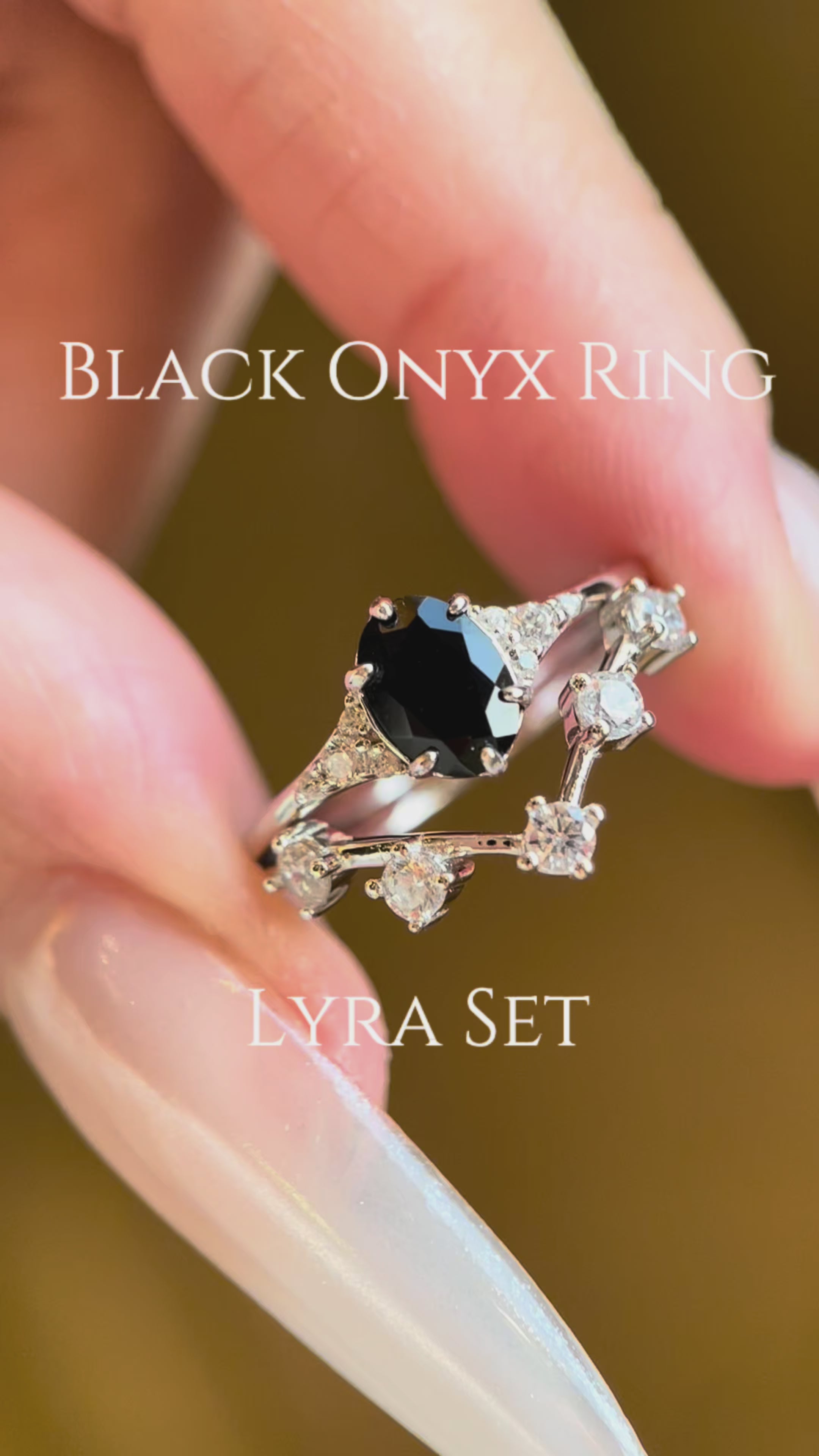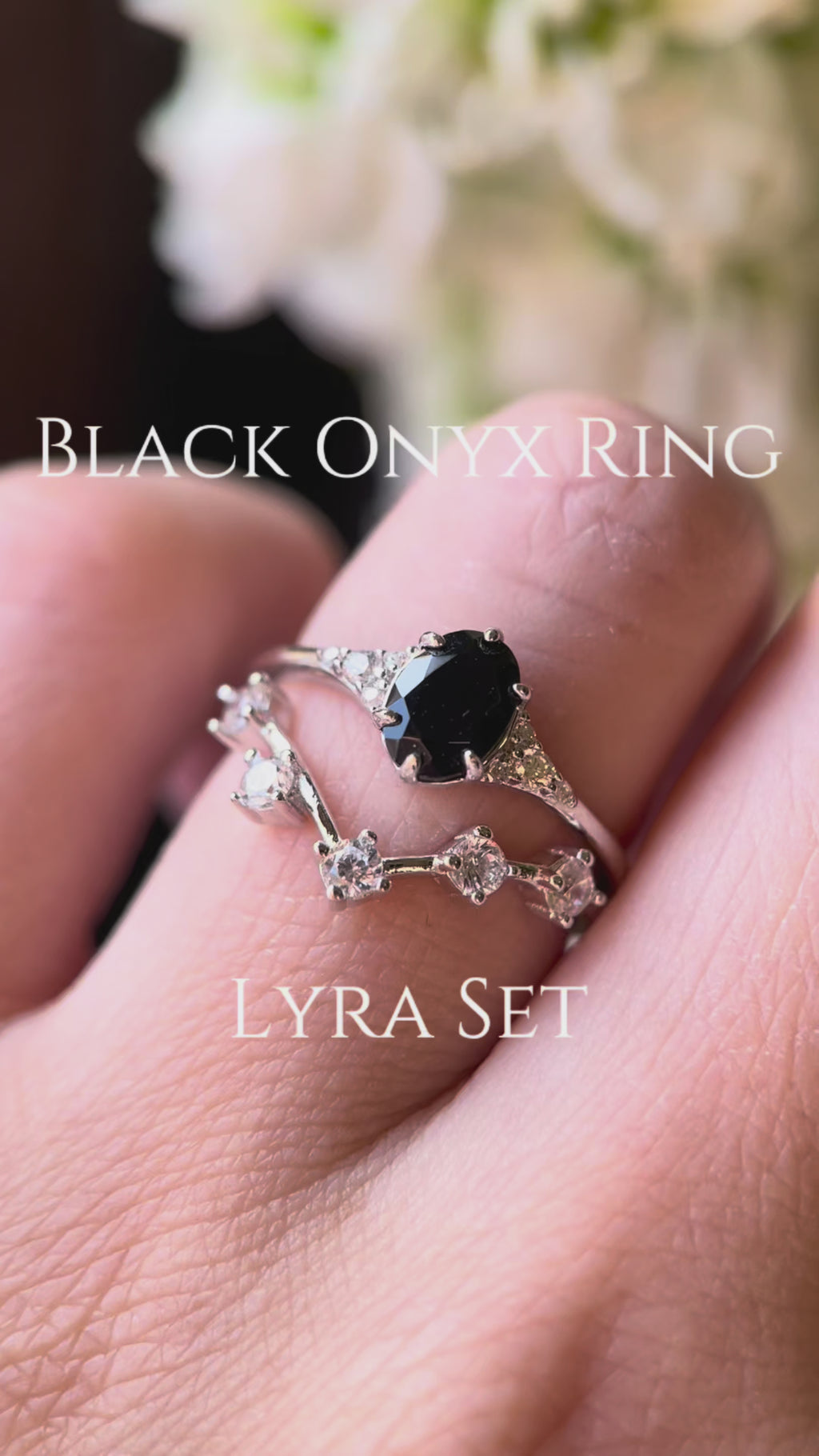 【Ensemble Lyra】Ensemble de 2 bagues de fiançailles ovales en onyx noir naturel fait main (0,75 ct).