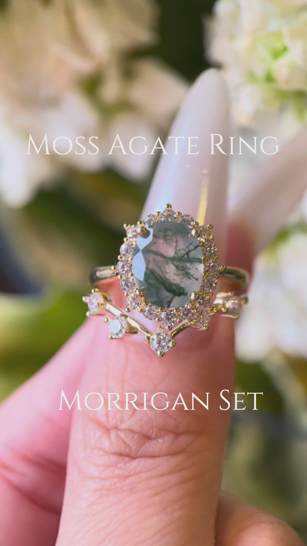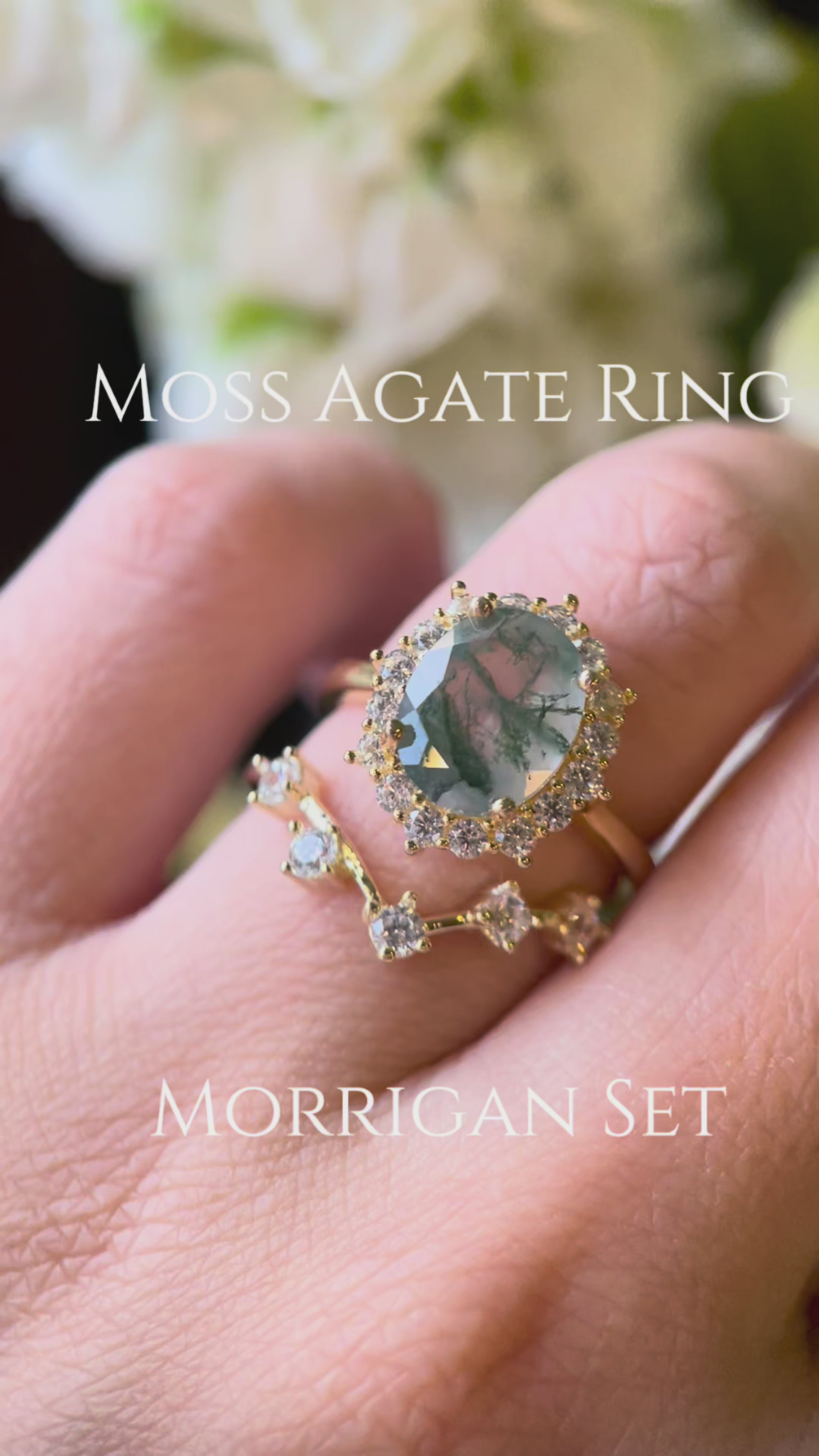 【Ensemble Morrigan】 Bague de fiançailles unique, faite main, en agate mousse verte naturelle, forme ovale, 3 carats (2 pièces).