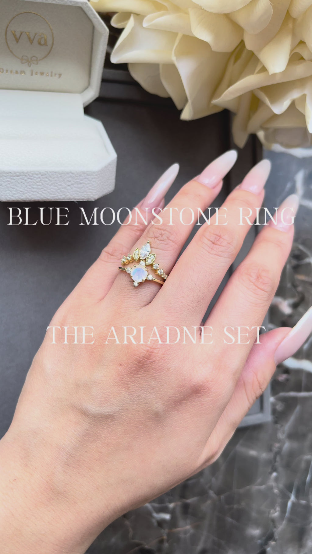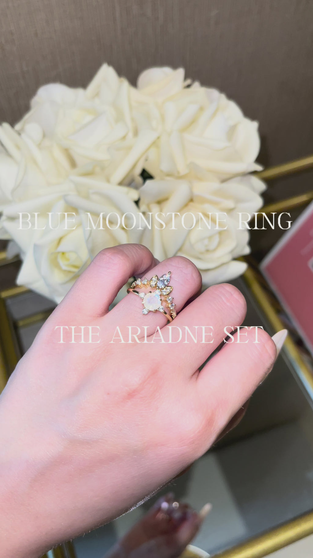 Discover the ethereal beauty of the ARIADNE engagement ring, featuring a stunning 0.8ct natural blue moonstone in a classic round shape. Each piece is meticulously handcrafted to showcase the stone's mesmerizing adularescence—that signature luminous glow that seems to float beneath the surface. This unique design celebrates the raw elegance of genuine moonstone, making it a meaningful choice for those seeking something beyond traditional diamonds. Perfect for an engagement ring that tells your individual love story with timeless sophistication and natural wonder.