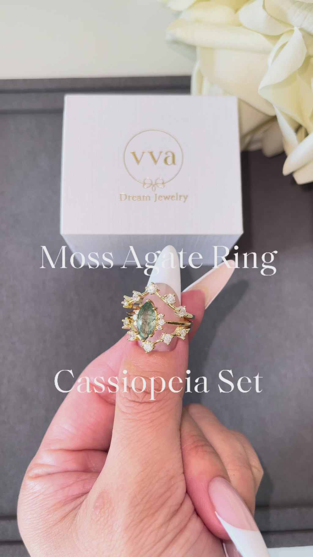 【CASSIOPEIA SET】Unique Handmade Natural Moss Agate Engagement Ring Set 3pcs Marquise Shape 1ct