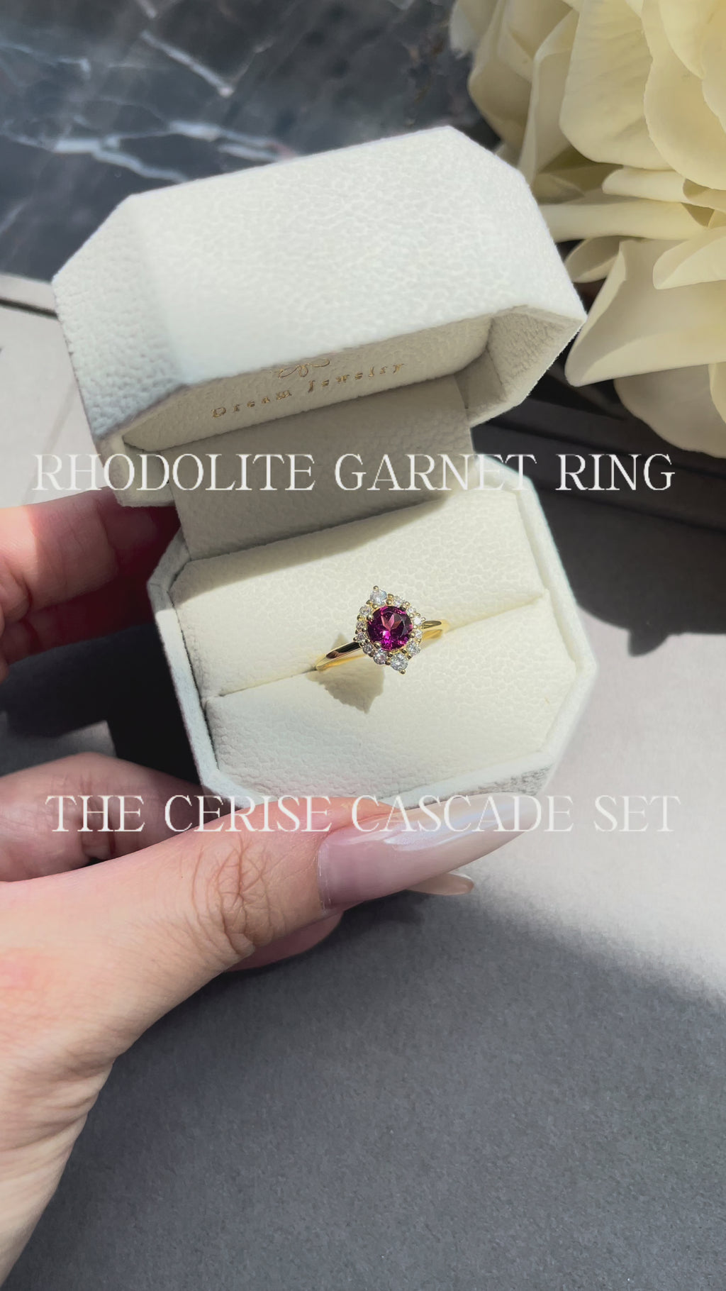 Introducing the Cerise engagement ring, a breathtaking piece featuring a natural rhodolite garnet stone. This 0.8ct round-cut gem radiates a captivating deep crimson brilliance that speaks to romance and commitment. Meticulously handcrafted to showcase the stone's natural beauty, this ring offers a distinctive choice for those who appreciate genuine gemstone character. Rhodolite garnet's rich color and durability make it an excellent alternative to conventional options, while its symbolic meaning of passion adds emotional depth to your engagement. A truly unique expression of love and individuality.