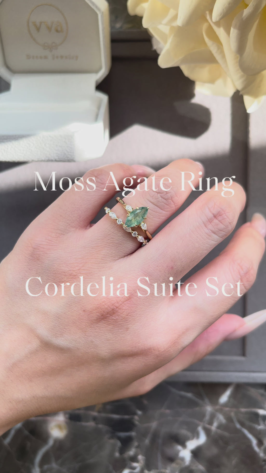 【Cordelia】Unique Handmade Natural Moss Agate Engagement Ring Set 2pcs 1ct Marquise Shape