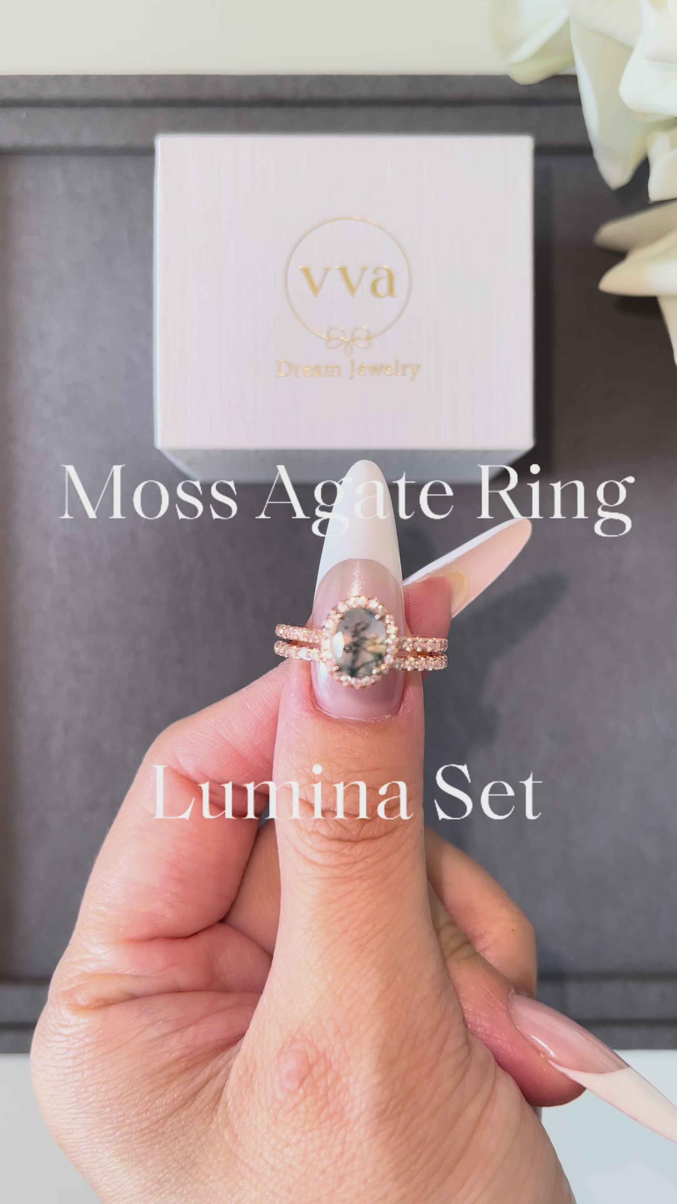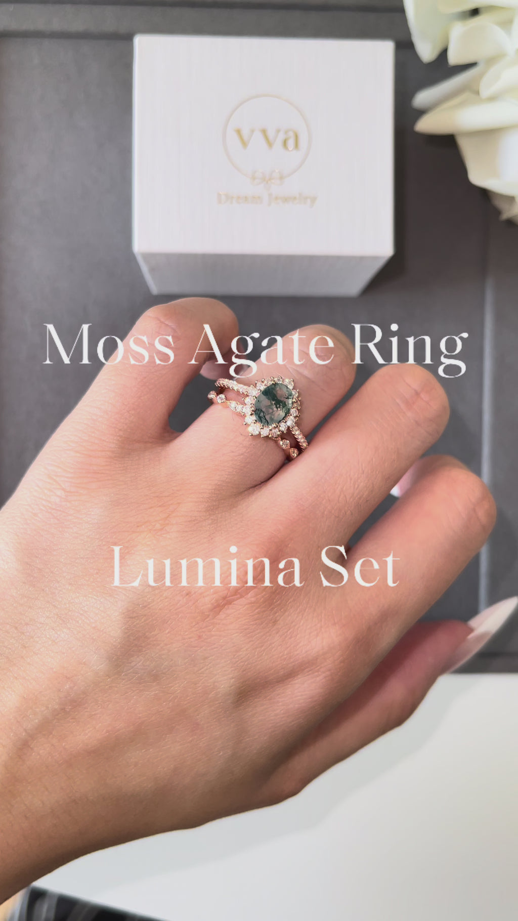 Discover the magic of nature with this enchanting two-piece engagement ring set featuring a stunning 1.5ct natural moss agate in elegant oval shape. Each ring is thoughtfully handcrafted to celebrate the unique beauty of this mesmerizing gemstone, with its distinctive green patterns reminiscent of an enchanted forest. Perfect for couples seeking something truly one-of-a-kind, this set combines timeless elegance with the organic charm of natural stone. Moss agate is believed to bring harmony and renewal to relationships, making it a meaningful choice for your special journey together. A distinctive alternative to traditional diamonds that tells your unique love story.