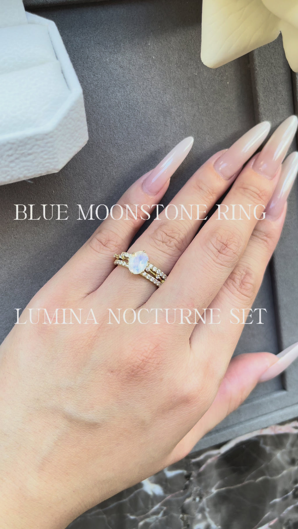 Celebrate your love story with the Eternal Phases Set, a stunning three-piece engagement ring collection featuring a 1.5ct natural blue moonstone in elegant oval shape. Each piece is meticulously handcrafted to showcase the moonstone's ethereal adularescence and captivating blue shimmer. This unique set combines timeless sophistication with the organic beauty of genuine gemstones, perfect for couples seeking something truly distinctive. The natural variations in each stone make your set one-of-a-kind, symbolizing the unique journey of your relationship. An heirloom-quality choice that celebrates both artistry and authenticity.