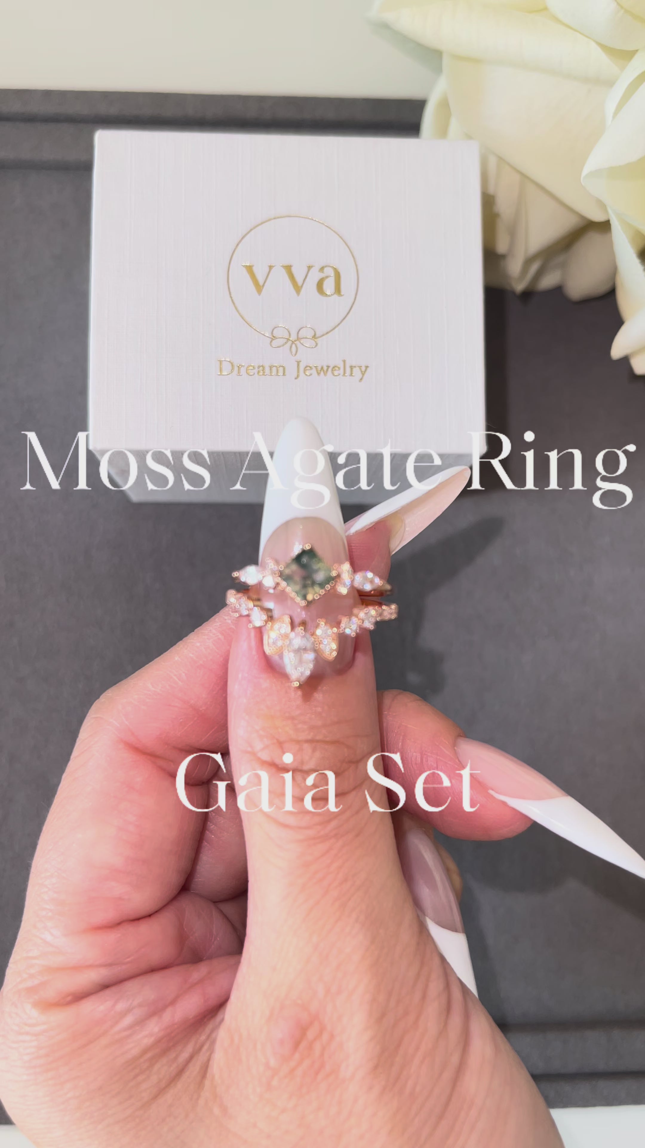 Discover the enchanting GAIA SET, a distinctive two-piece engagement ring collection featuring natural moss agate in a captivating princess cut. Each stone weighs 0.75ct, showcasing the organic beauty and unique patterns that make moss agate truly one-of-a-kind. Handcrafted with meticulous attention to detail, this set combines a striking engagement ring with a complementary band, perfect for those seeking something beyond traditional diamonds. The verdant hues and natural inclusions of moss agate symbolize growth and new beginnings, making it an meaningful choice for your special journey. Embrace individuality with this artisan-created treasure that celebrates nature's artistry.