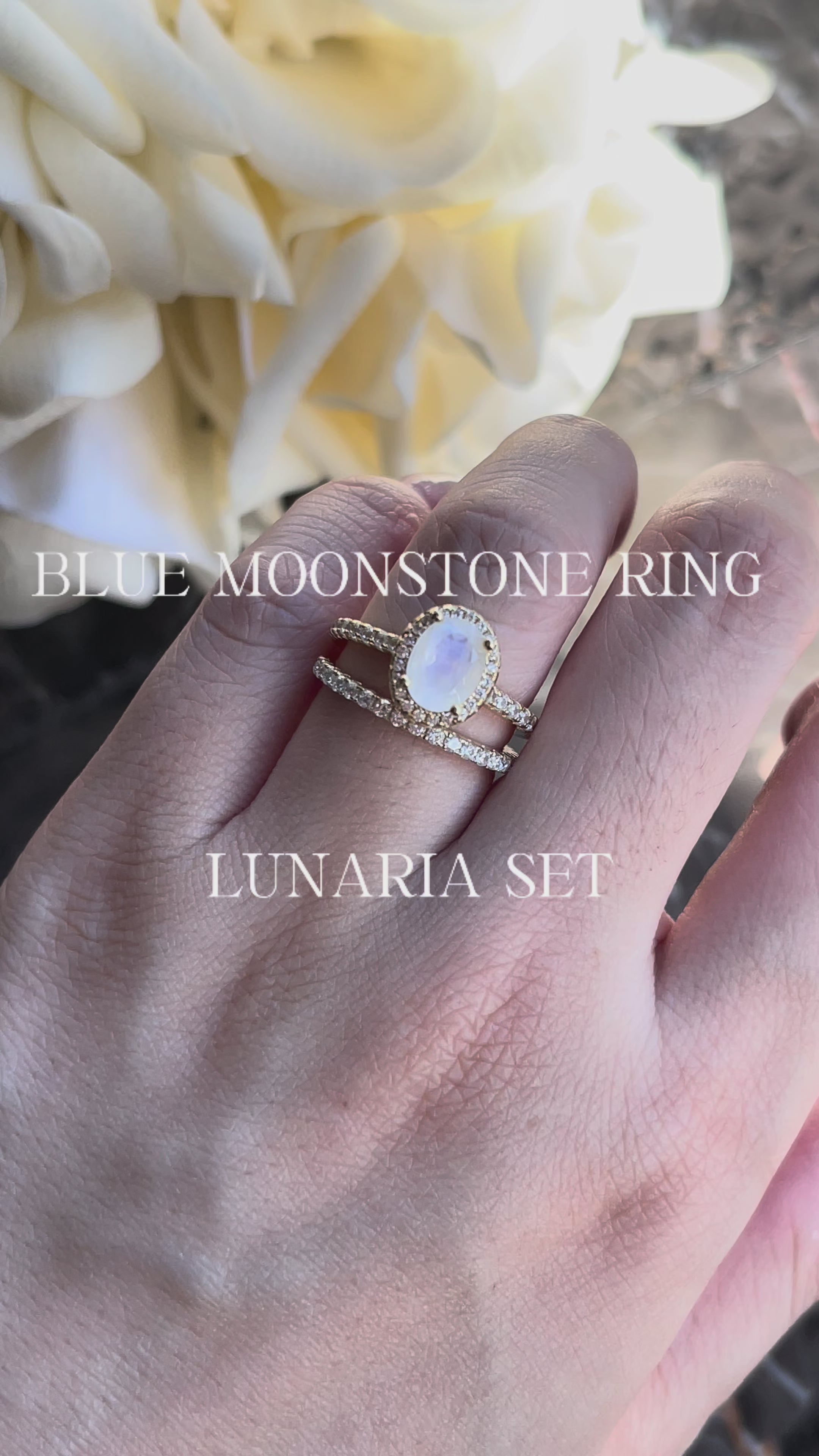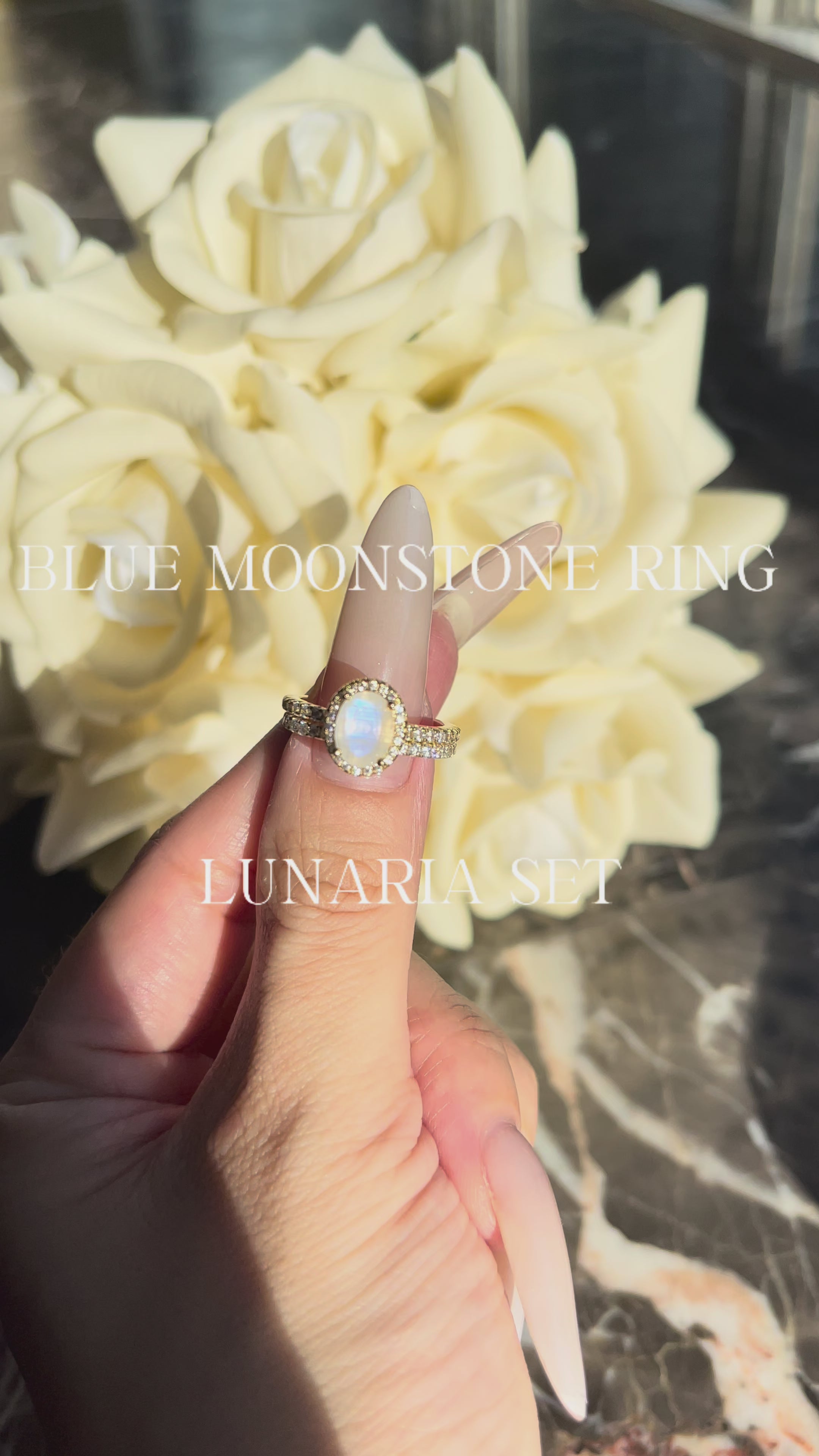 Introducing the Lunaria engagement ring—a celestial masterpiece featuring a stunning 1.5ct natural blue moonstone in an elegant oval cut. Each piece is meticulously handcrafted to showcase the moonstone's ethereal adularescence, that mesmerizing shimmer that seems to glow from within. This unique design celebrates the stone's natural beauty and individuality, making it a meaningful choice for those seeking something truly distinctive. Perfect for the modern bride who values authenticity and artisanal craftsmanship, the Lunaria ring combines timeless elegance with contemporary artistry. A one-of-a-kind symbol of your love story.