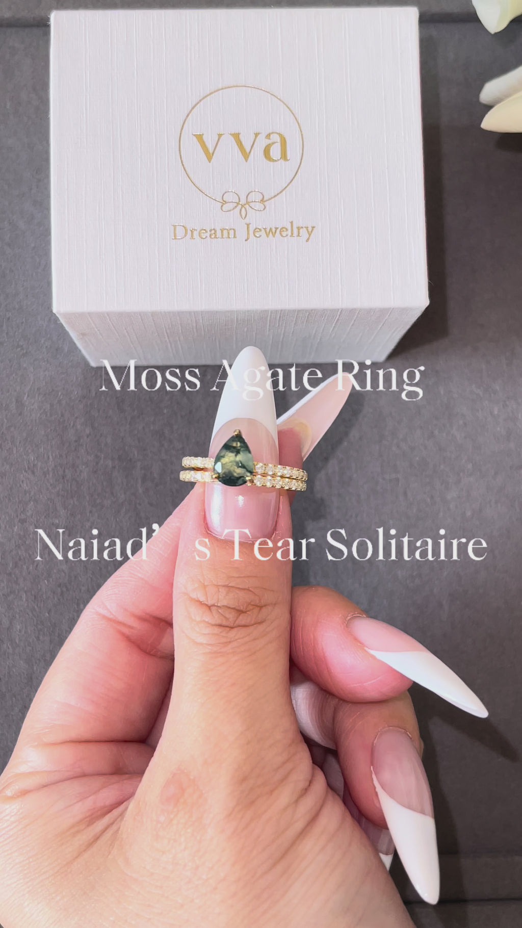 【Naiad Set】Unique Handmade Natural Moss Agate Engagement Ring Set 2pcs 0.8ct Pear Shape