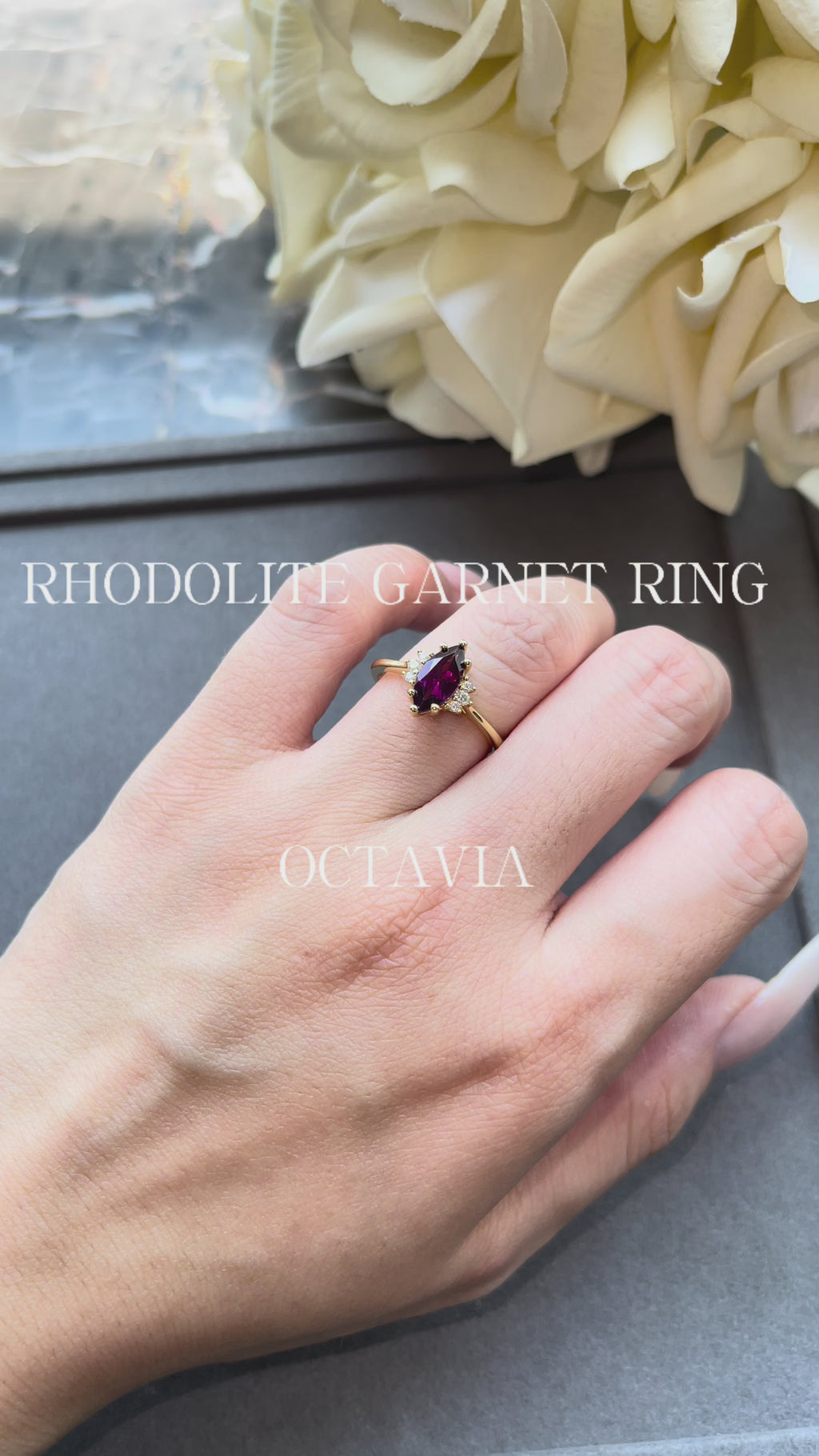 Introducing Octavia, an exquisite handmade engagement ring featuring a stunning 1-carat natural rhodolite garnet in an elegant marquise cut. This sophisticated piece celebrates the deep crimson beauty of rhodolite, a premium garnet variety prized for its rich color and exceptional clarity. Each ring is meticulously crafted by hand, ensuring unique character and superior quality. The marquise shape elongates the finger while maximizing the stone's radiant sparkle. Perfect for those seeking a distinctive alternative to traditional diamonds, this ring combines timeless elegance with meaningful gemstone artistry. A truly special choice for marking life's most precious moments.