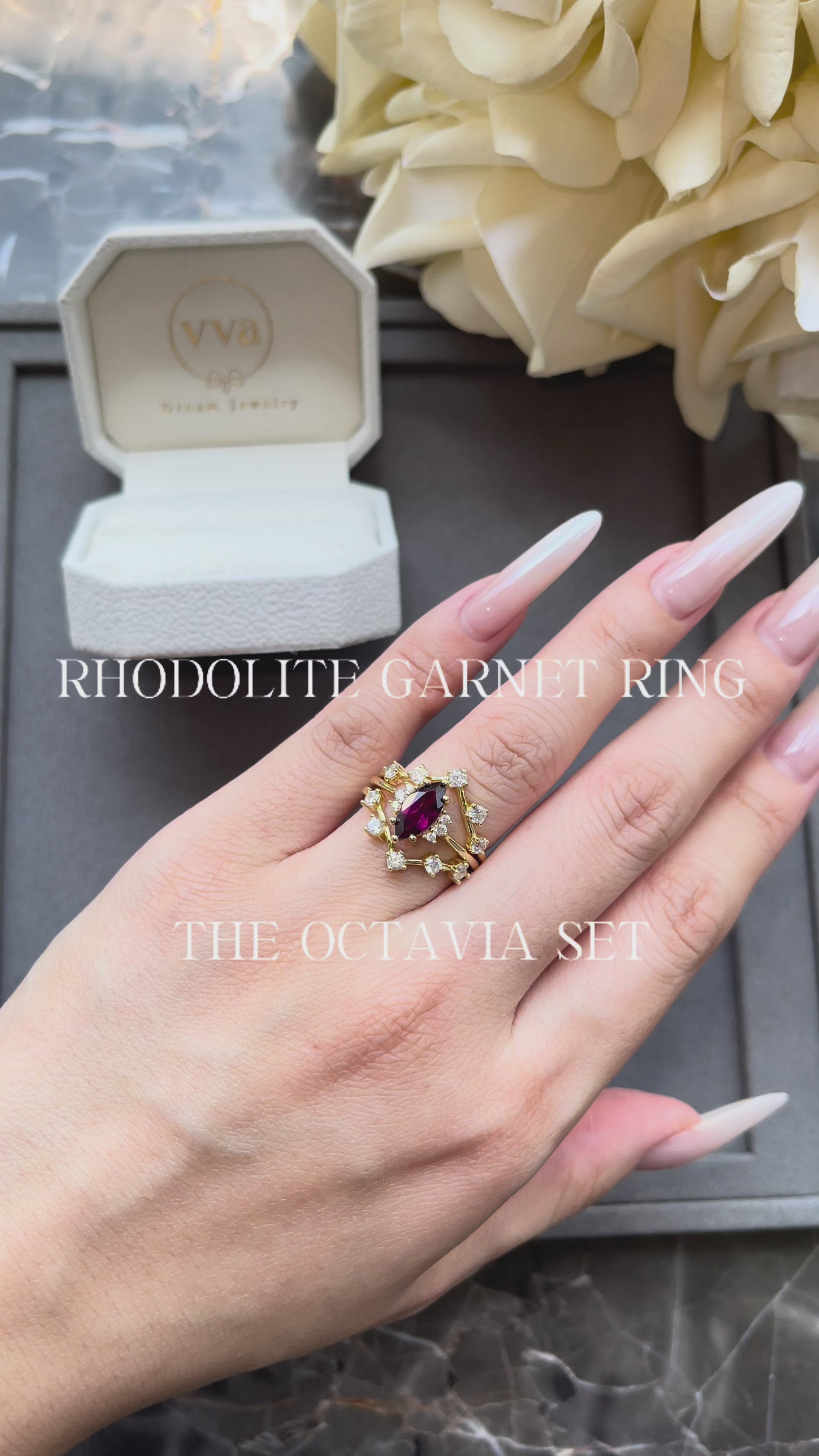 【Octavia SET】Handmade Natural Rhodolite Garnet Engagement Ring Set 3pcs Marquise Shape 1ct