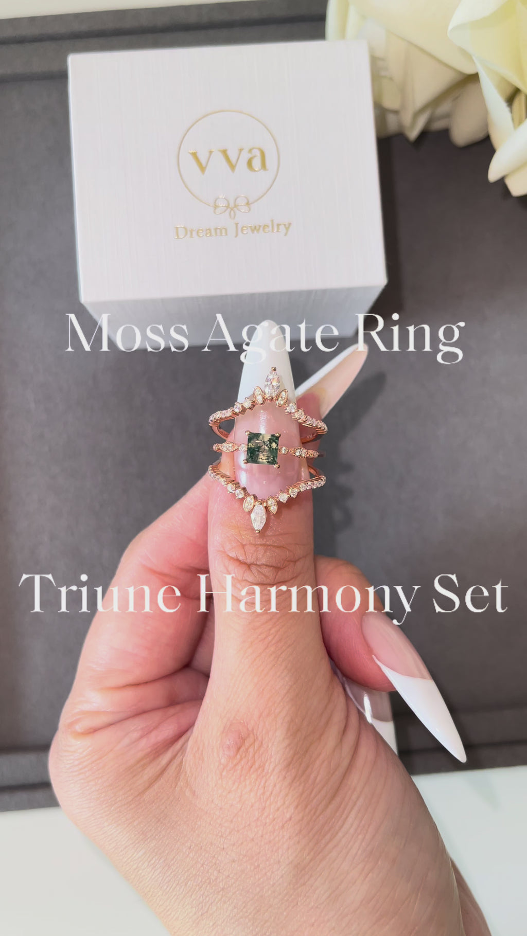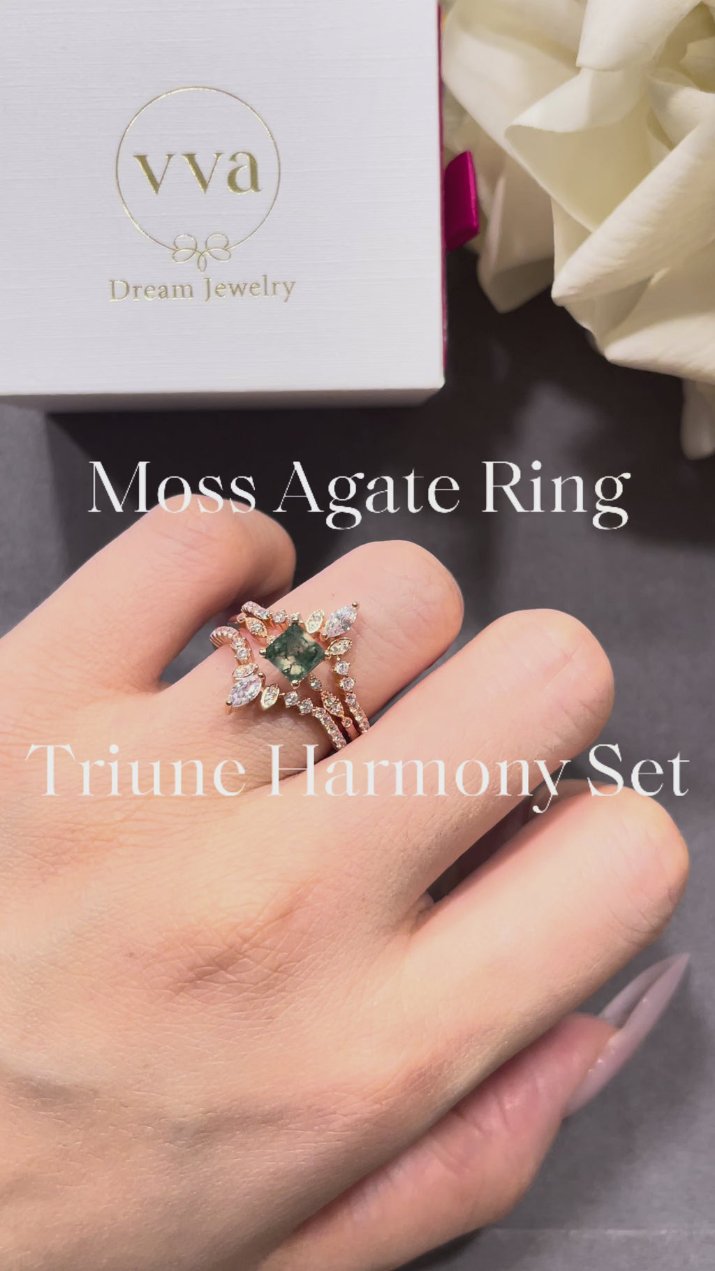 Discover the enchanting OPHELIA SET, a stunning three-piece engagement ring collection featuring a natural moss agate centerpiece. This 0.75ct princess-cut gemstone showcases nature's artistry with its unique green patterns, making each ring truly one-of-a-kind. Expertly handcrafted to perfection, this set combines timeless elegance with organic beauty. The moss agate's calming green hues symbolize growth and renewal, perfect for celebrating your love story. Whether you're seeking an alternative to traditional diamonds or a conversation-starting piece, the OPHELIA SET offers distinctive charm and meaningful craftsmanship that reflects your individual style.