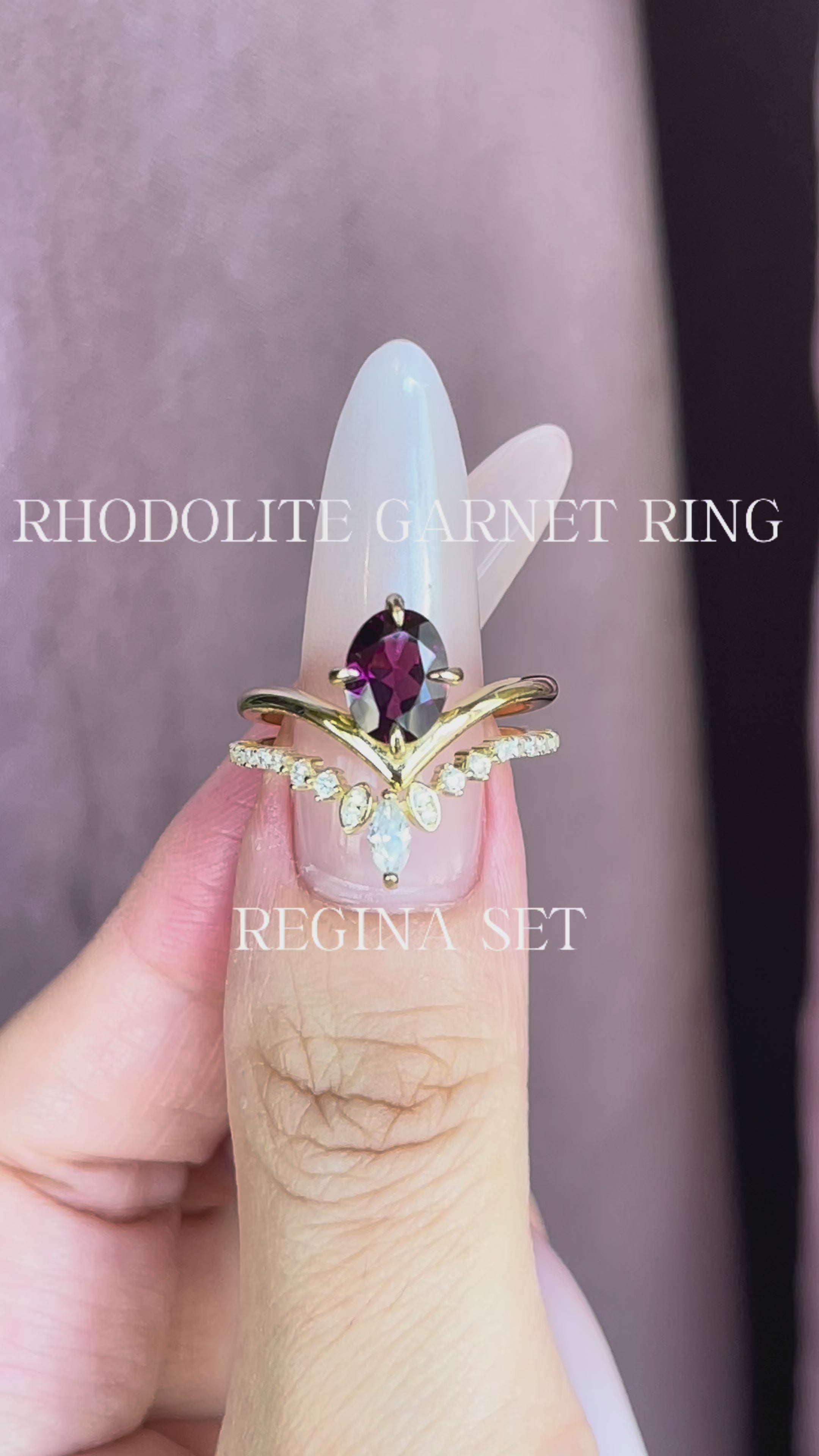 Discover timeless elegance with the REGINA Engagement Ring Set, featuring two exquisite handcrafted pieces centered on a stunning 1.5ct natural rhodolite garnet. The rich, wine-hued oval stone radiates sophistication and romance, making it a distinctive choice for those seeking something beyond traditional diamonds. Each ring is meticulously handmade to ensure quality and uniqueness. Rhodolite garnet symbolizes passion and commitment, adding meaningful depth to your engagement. Perfect for couples who appreciate artisanal craftsmanship and the natural beauty of gemstones. This two-piece set offers versatility for everyday wear and special occasions alike.