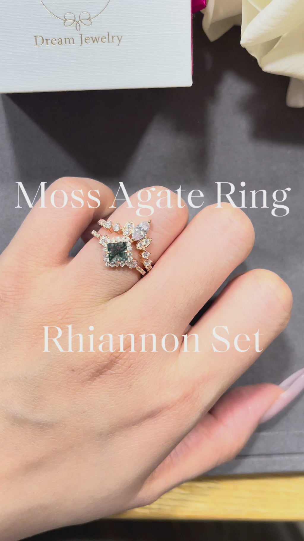 Introducing the RHIANNON engagement ring—a distinctive choice for those who embrace individuality. This handcrafted piece features a stunning 0.75ct natural moss agate cut in an elegant princess shape, showcasing the stone's unique green patterns and organic beauty. Each ring is meticulously created by hand, ensuring no two pieces are identical. Perfect for the modern bride seeking something beyond traditional diamonds, this ring celebrates nature's artistry while making a meaningful statement about personal style and authenticity.