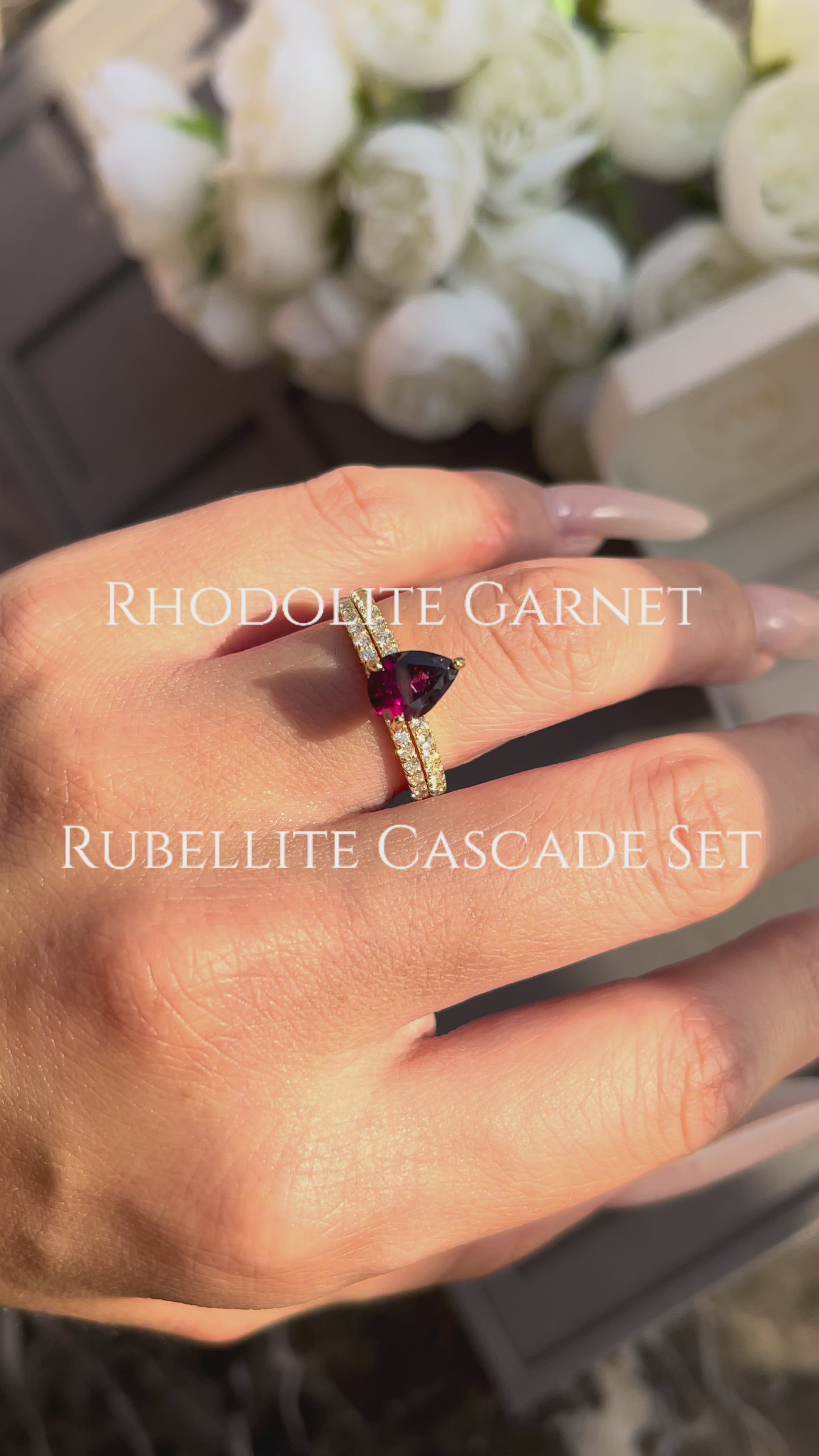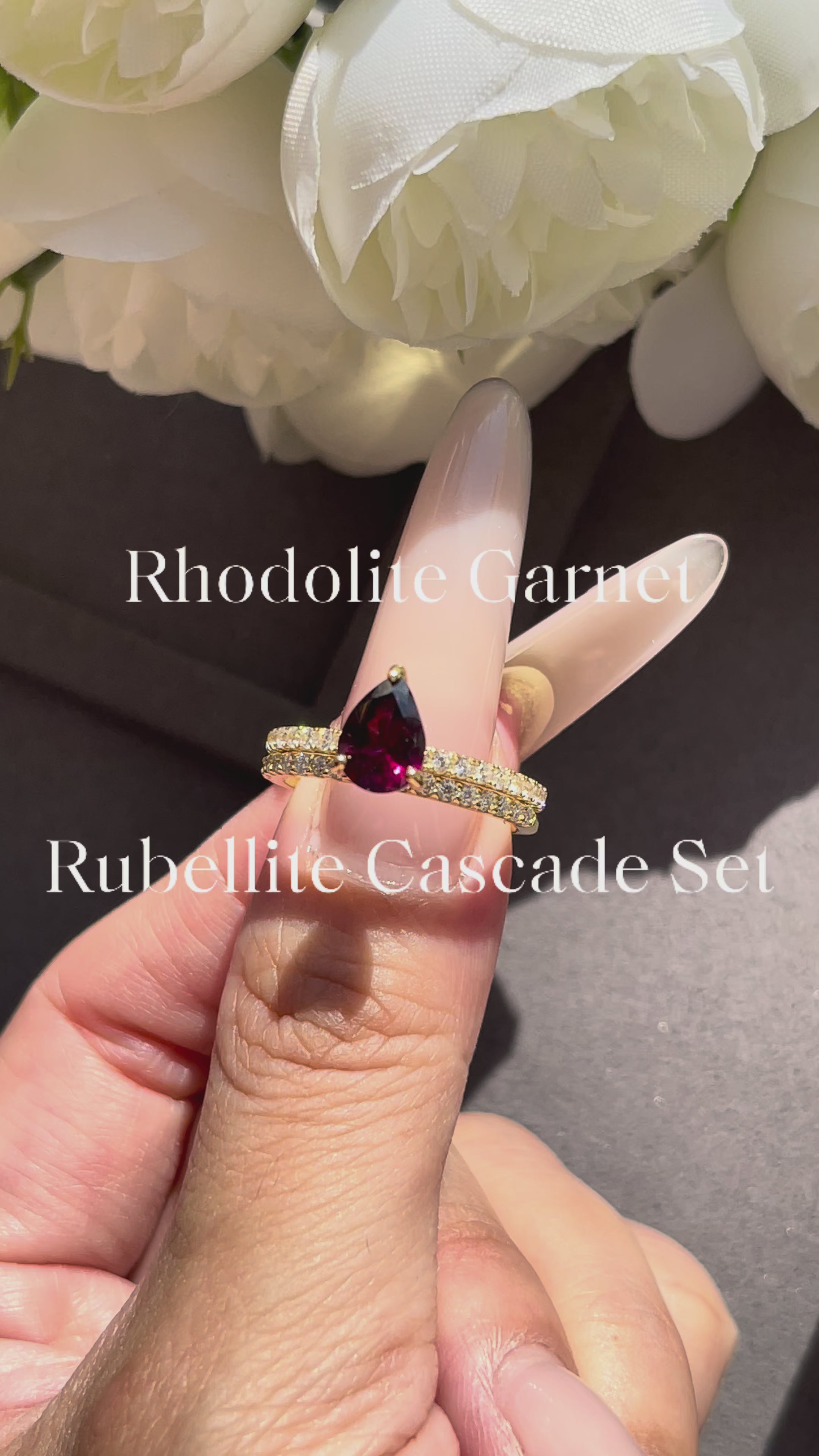 【Rubellite Cascade Set】Unique Handmade Natural Rhodolite Garnet Engagement Ring Set 2pcs 0.8ct Pear Shape