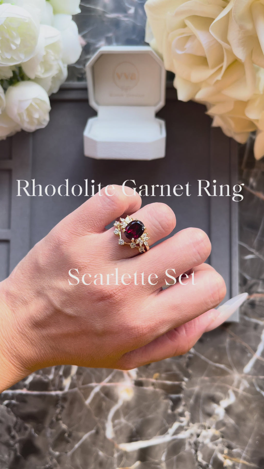 Introducing the SCARLETTE—a stunning handmade engagement ring featuring a natural 3-carat rhodolite garnet in an elegant oval cut. This deep crimson gemstone radiates warmth and sophistication, offering a distinctive alternative to traditional diamonds. Each piece is meticulously crafted to showcase the garnet's rich color and brilliant sparkle. Perfect for those seeking a meaningful, one-of-a-kind ring that celebrates individuality and timeless beauty. A truly special choice for your most precious moments.
