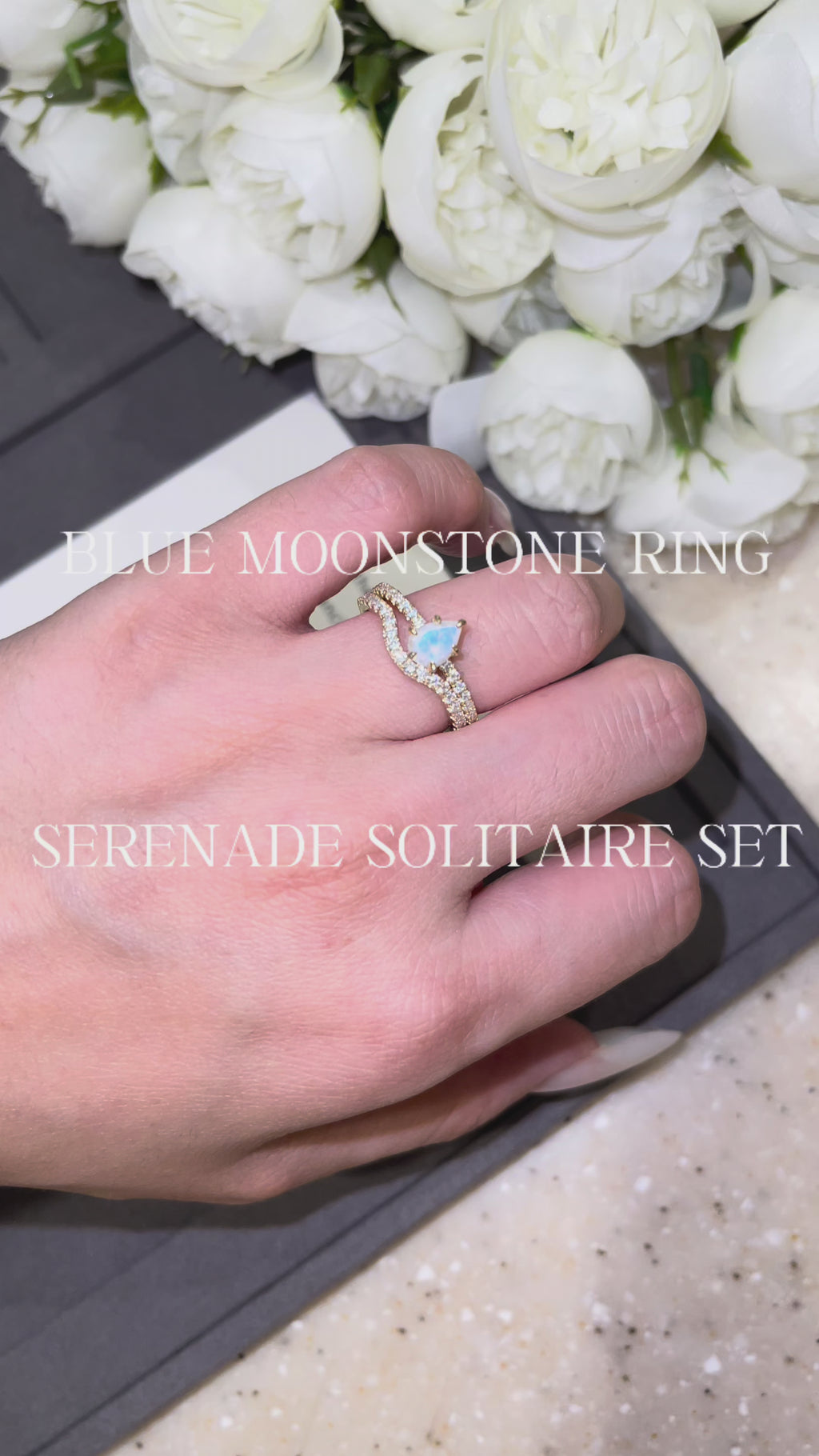 【Serenade Solitaire】Unique Handmade Natural Blue Moonstone Engagement Ring Set 2pcs 0.7ct Pear Shape