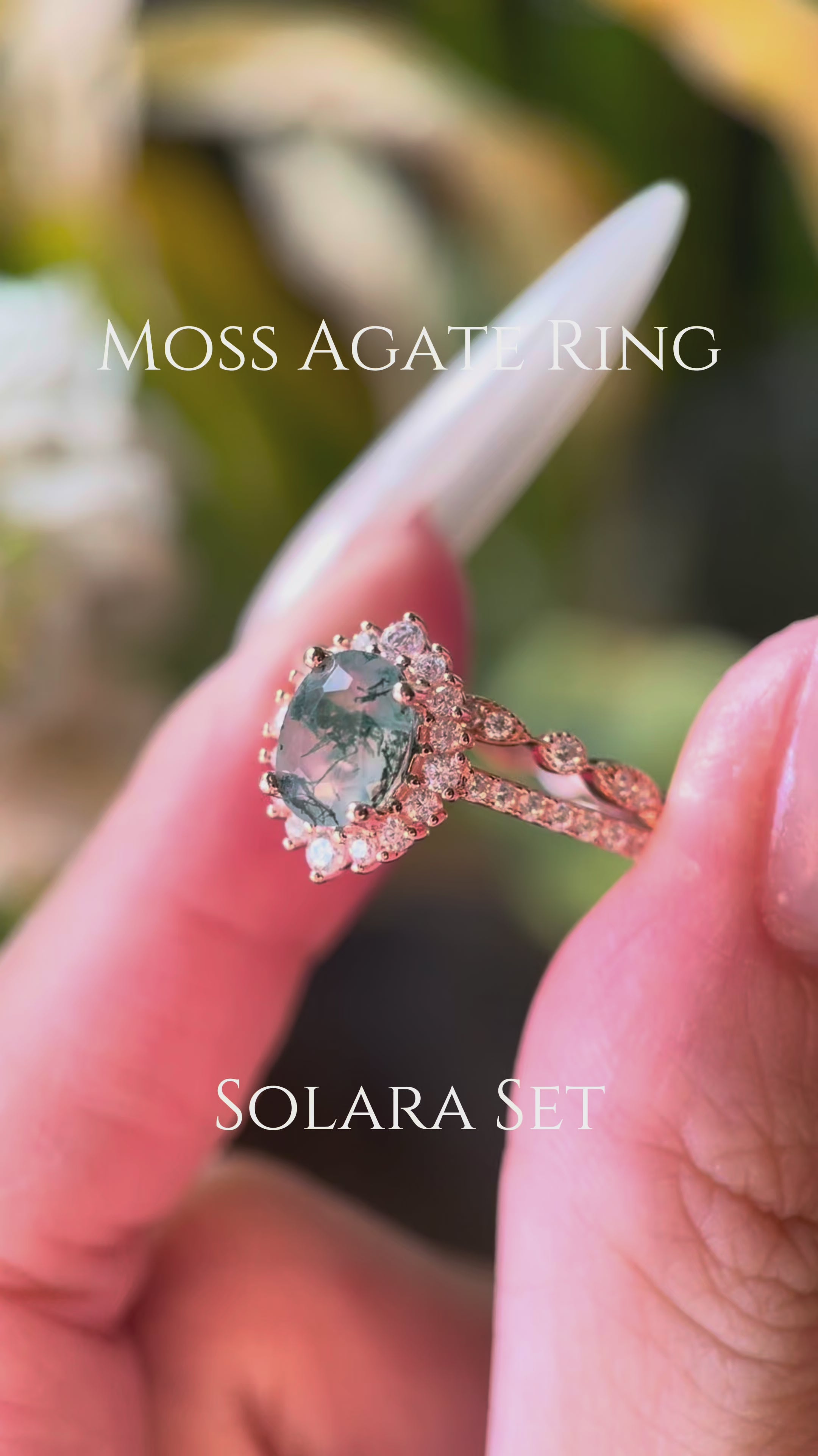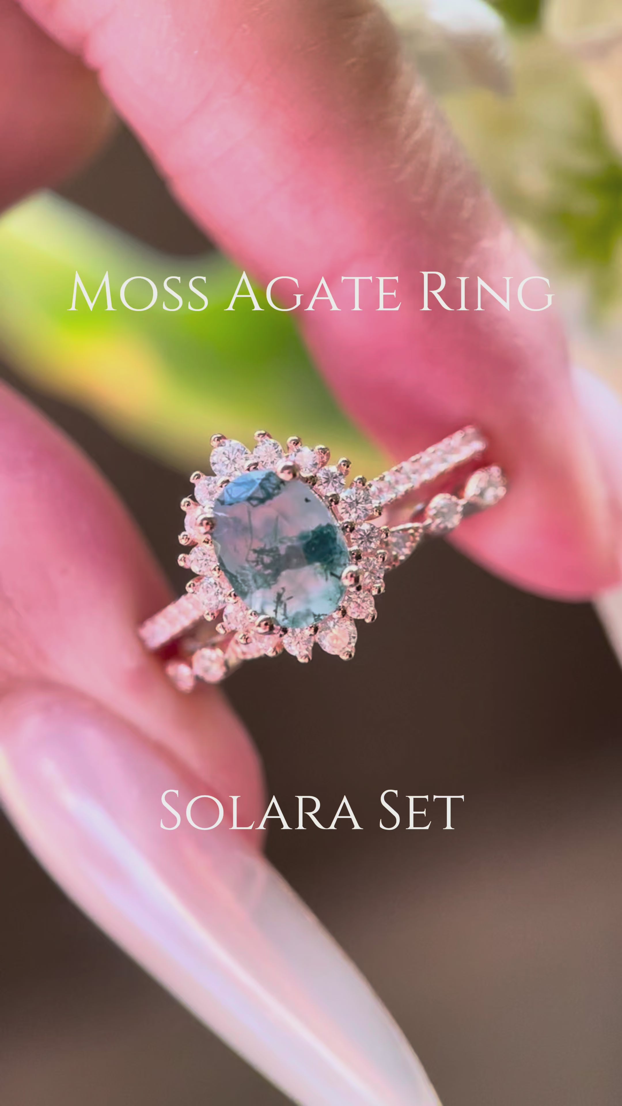 Introducing the Solara collection—a stunning handmade engagement ring set featuring natural moss agate. This two-piece set showcases a captivating 1.5ct oval-shaped moss agate stone, celebrated for its unique green inclusions that make each piece truly one-of-a-kind. Crafted with meticulous attention to detail, these rings blend timeless elegance with nature's artistry. Perfect for those seeking an alternative to traditional diamonds, moss agate symbolizes growth and renewal. Whether you're celebrating an engagement or marking a special milestone, the Solara set offers distinctive beauty and meaningful craftsmanship that tells your unique love story.