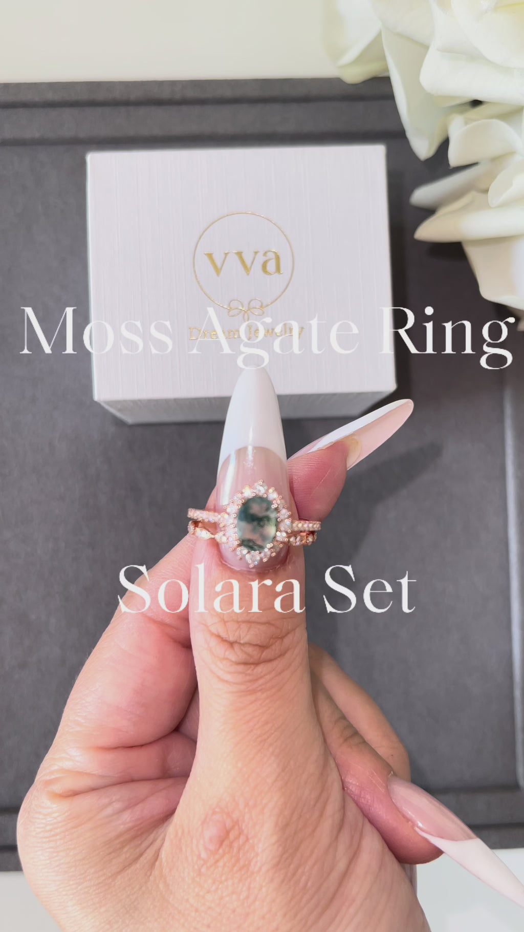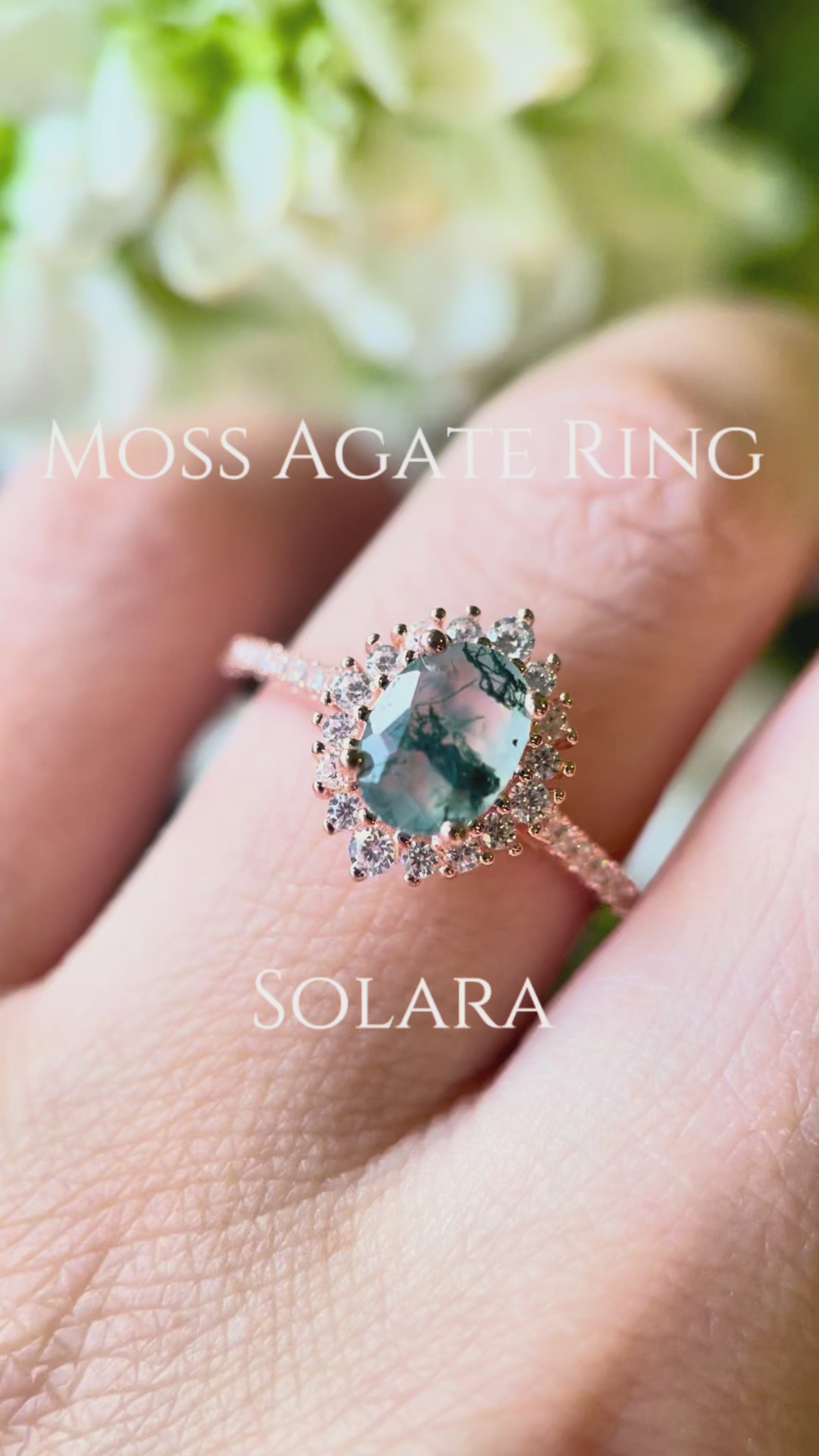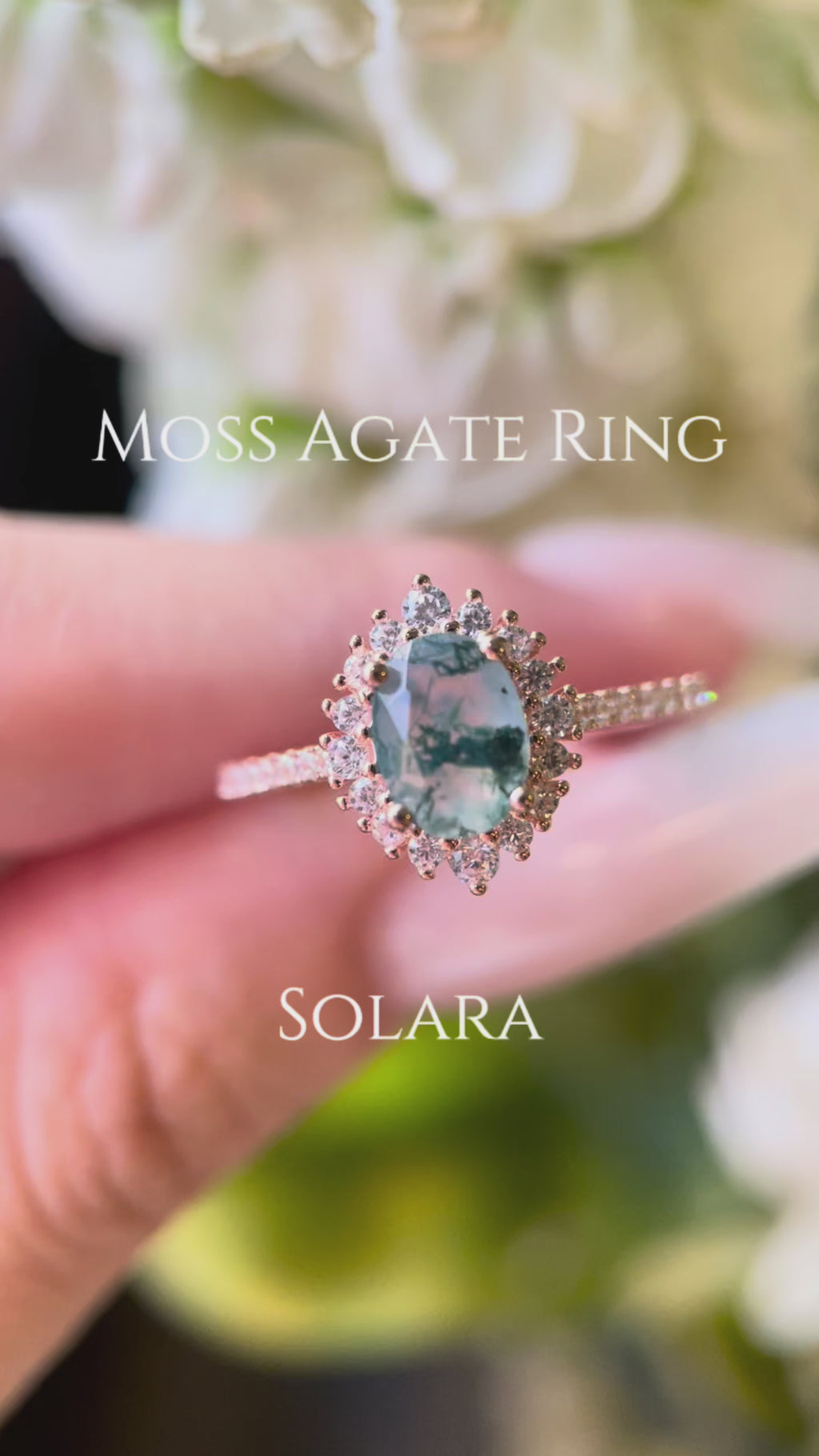 Discover the enchanting beauty of the Solara engagement ring, featuring a stunning 1.5ct natural moss agate in a graceful oval cut. Each piece is meticulously handcrafted to celebrate the unique patterns and earthy green hues found only in nature's moss agate. This one-of-a-kind ring combines timeless elegance with organic charm, making it a meaningful choice for those who appreciate individuality and natural gemstones. Perfect for the modern bride seeking something truly distinctive, the Solara ring is a testament to artisanal craftsmanship and the raw beauty of nature.